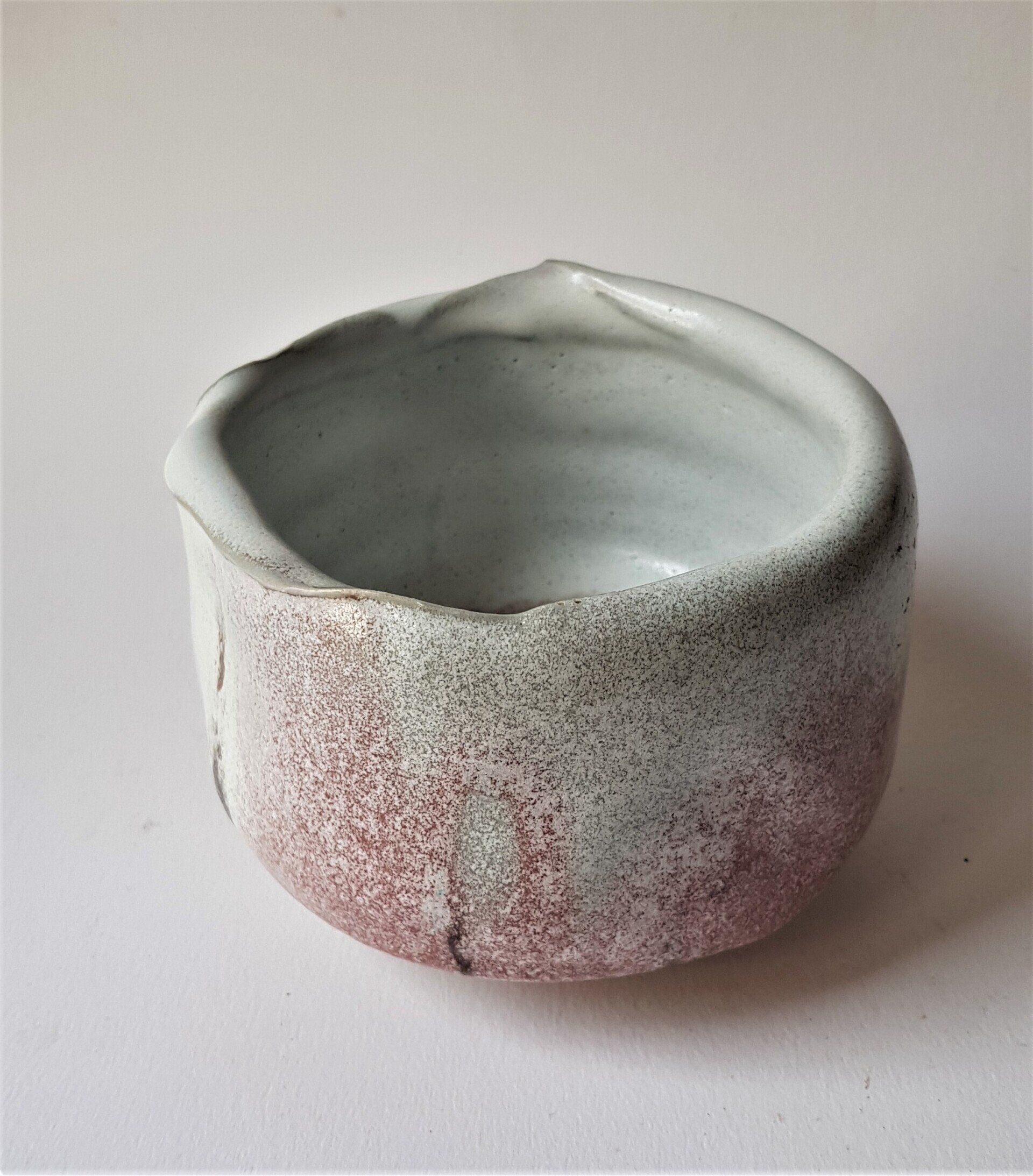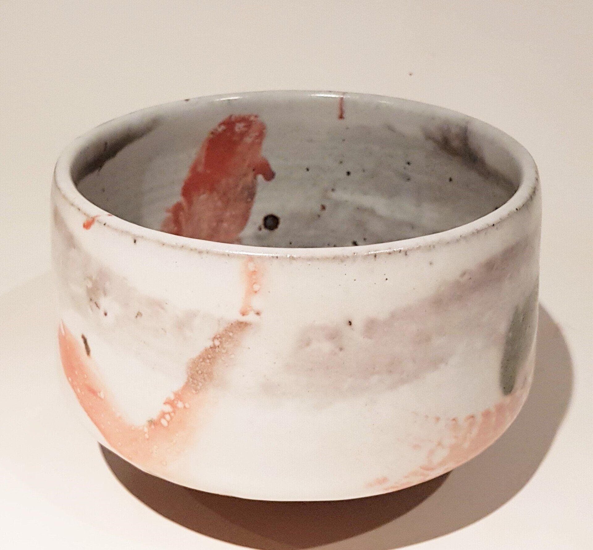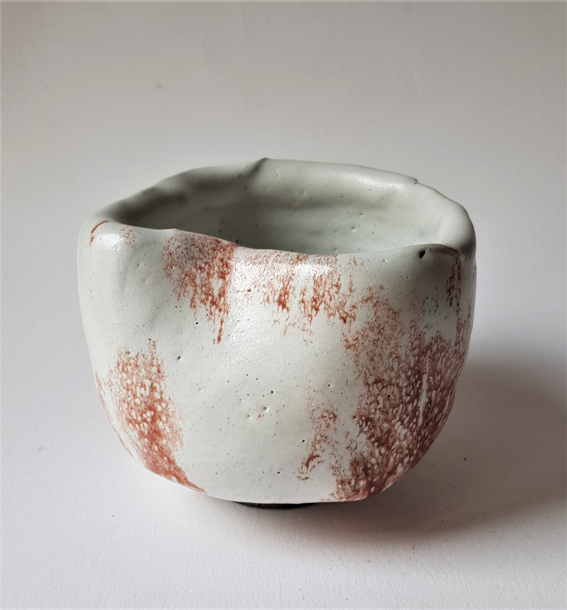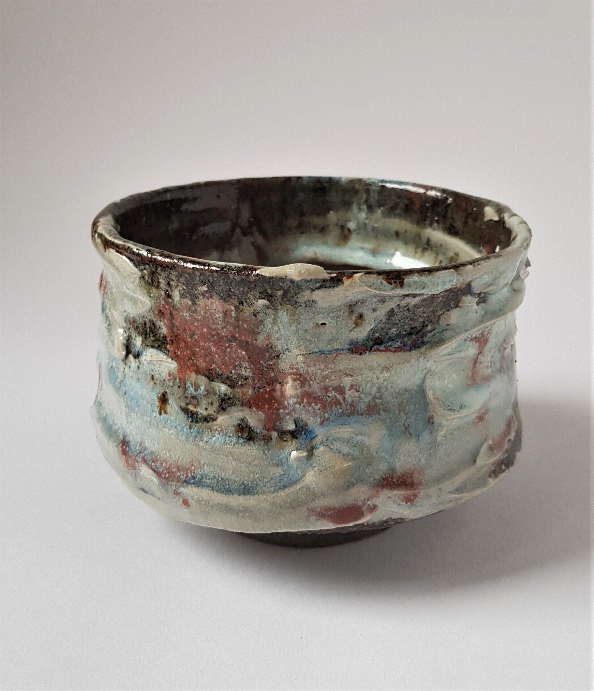 Chawan- veldspaat glazuur met klei- rivier slib- wax resist deco-1280°-Red: 125 euro